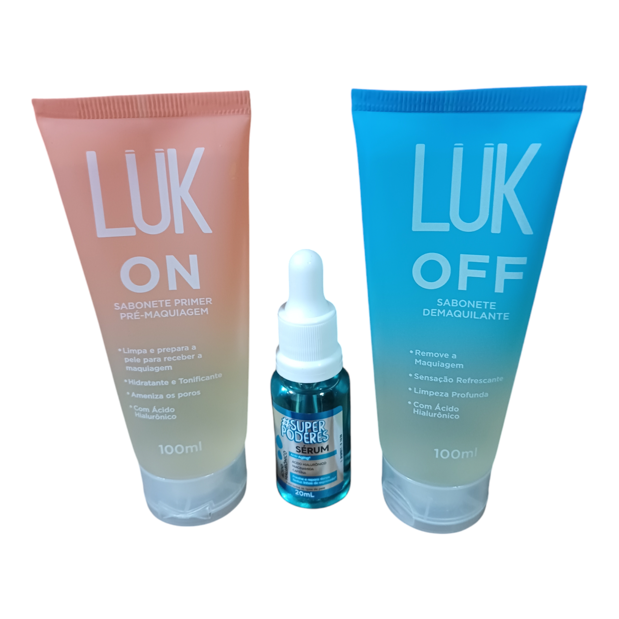 Kit Skincare- Sabonete On e Off da LUK + Sérum Facial Super Poderes. Todos com Ácido Hialurônico na composição.